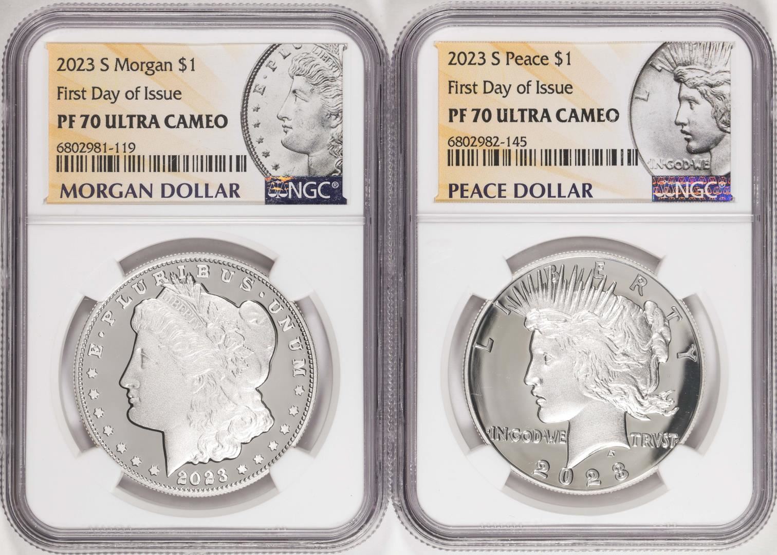 One Lot of (2) 2023-S $1 Proof Morgan/Peace Silver Dollar Coins NGC PF70 Ultra Cameo FDOI. NGC Certified.