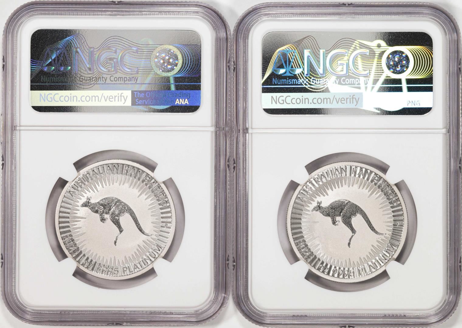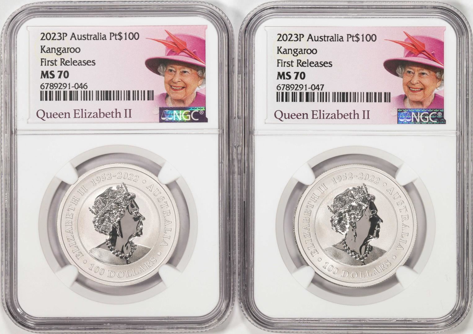 One Lot of (2) 2023P Australia $100 Kangaroo 1oz Platinum Coins NGC MS70 First Releases. NGC Certified.
