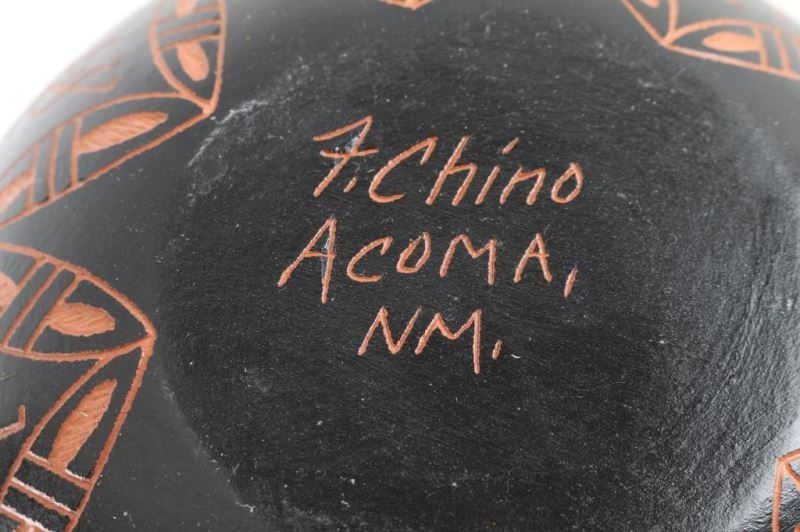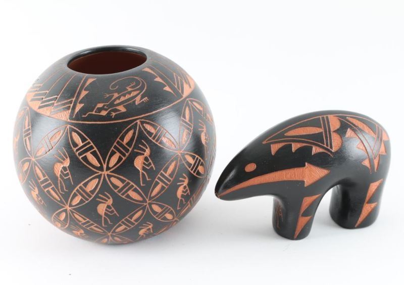 including an Acoma Kokopeli incised carved pot measures 5"x5" and signed Francine Chino and a carved pottery bear effigy also signed Francine Chino