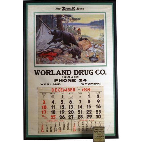 Lot of 2 Adv Pieces : 1939 Calendar & Tobacco Tin - Calendar is a Worland Drug Co. Worland, WY 45 x 30 & Tin is a "Birds Eye"