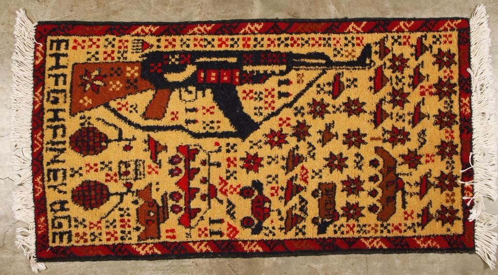 2 of same designs AK-47, bomb and pistol woven design in red and brown tones. Measures 14.8x'3.4', good condition.