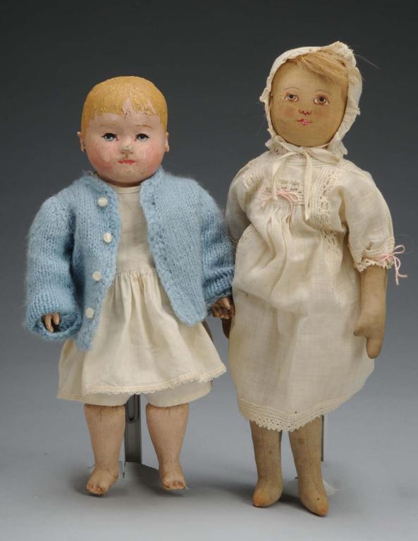 Description Largest is a "Baby Land Rag" doll with painted facial features and human hair covered by bonnet. Also includes a Martha Chase baby with molded and painted features. Condition (Good). Size Largest: 14" T.
