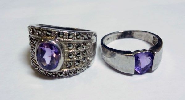 Great set of 2 Amythist Sterling Silver Rings, The heart shaped ring is a size 7, and the one with the oval stone is size 6.5. Total weight of both rings together is .33 ozt
