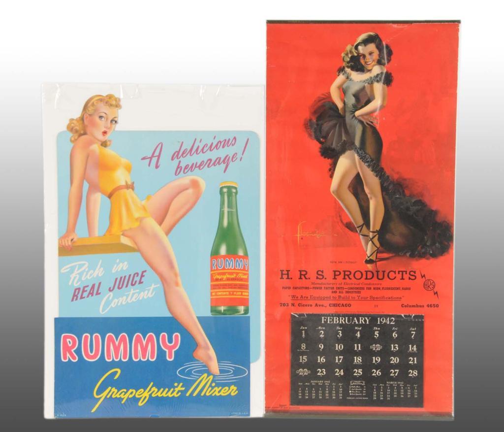 Includes one 1942 HRS Products Calendar and one 1950s Rummy cardboard cut-out sign. Both are very clean with only minor marks and light wear. Calendar features Rolf Armstrong artwork. Condition (9.0+, Near Mint). Size Largest: 23" T.