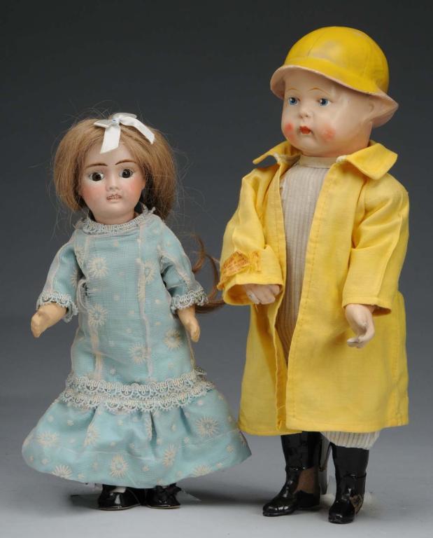 Description Largest is a composition boy with molded hat wearing a rain coat, one-piece outfit, and high boots advertising for Uneeda Biscuit. The smaller, is a French bisque head doll with open/close mouth signed Petite Francaise on a five-piece composition body. One firing crack to the back of her head and scrubbed eyelids. Condition (Good). Size Largest: 15" T.