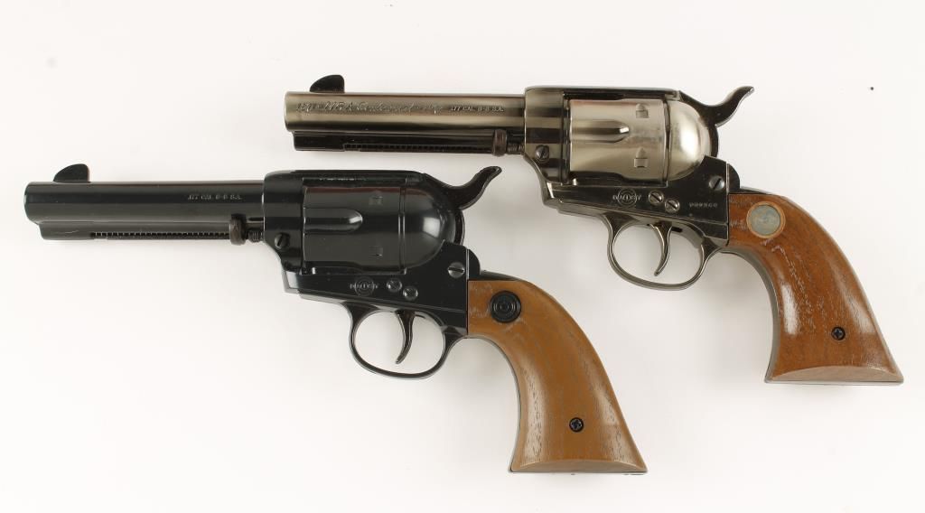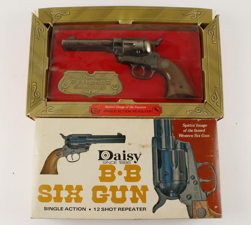 (1) Daisy B.B. Six Gun Single Action 12 Shot Repeater, model 179. Overall good condition, in original box with manual. (1) NRA Centenial B.B. Pistol Crafted by Daisy. "Spittin' Image of the Famous Colt Single Action Revolver" In overall good condition, shows some wear and missing grip button. In original box which has some damage.