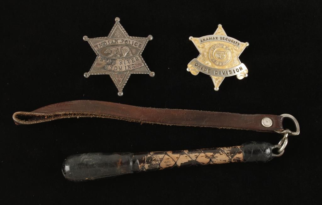 (1) Indian Police Wind River Wyoming. (1) Anamax Security Oxide Division, State of Arizona. Also includes (1) Vintage leather wrapped lawman's sap. Wrist strap intact, approx 6" long.