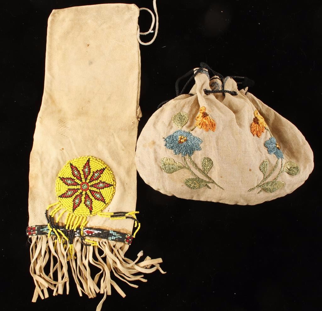 1 Vintage Bag, fabric construction with floral embroidery, and 1 Rawhide Bag with round beaded design embellished with fringe. Beaded edge on flap of bag. Both show age.
