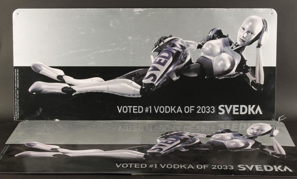 depicting a female Svedka robot reclining above the words "Voted #1 Vodka of 2033 SVEDKA".