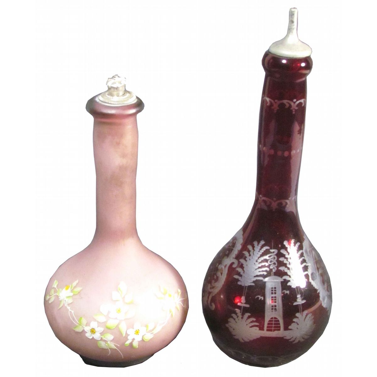 Lot of 2 Barber Bottles. Mary Gregory cranberry and frosted mauve hand painted. No chips or cracks. Tall bottle measures 10 inches.