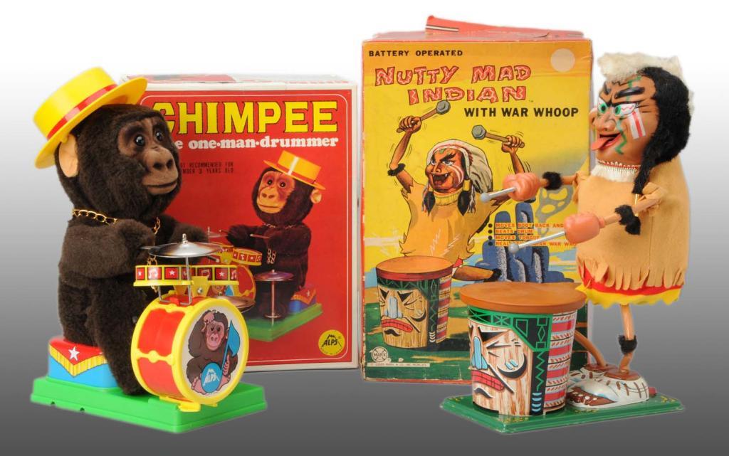 Description Japanese. Working. Includes one Nutty Mad Indian and one Chimpanzee one-man drummer band. Includes original boxes. Condition (Very Good - Near Mint). Size Largest: 12".