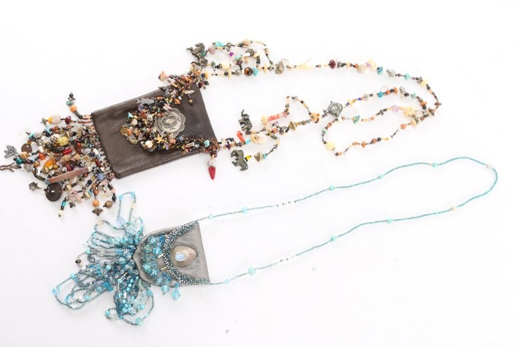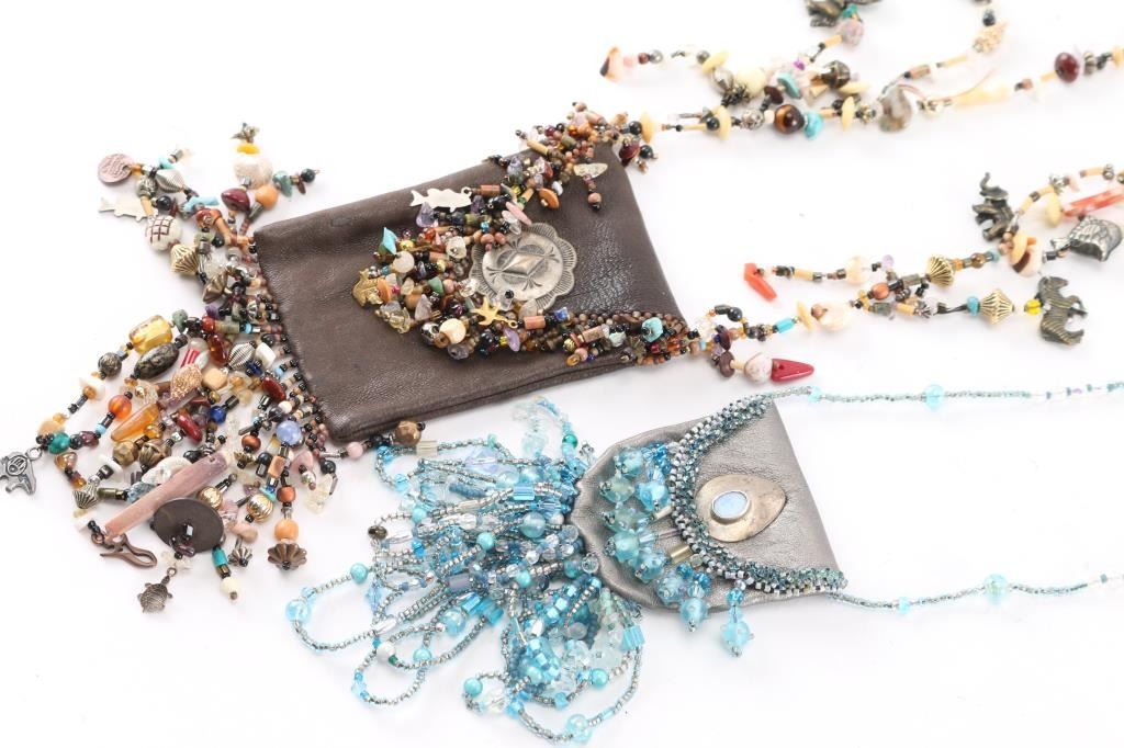 (1) Brown leather pouch measuring 3 3/4", multi colored beads and charms and a stamped silver decoration in center. Total measures 20".