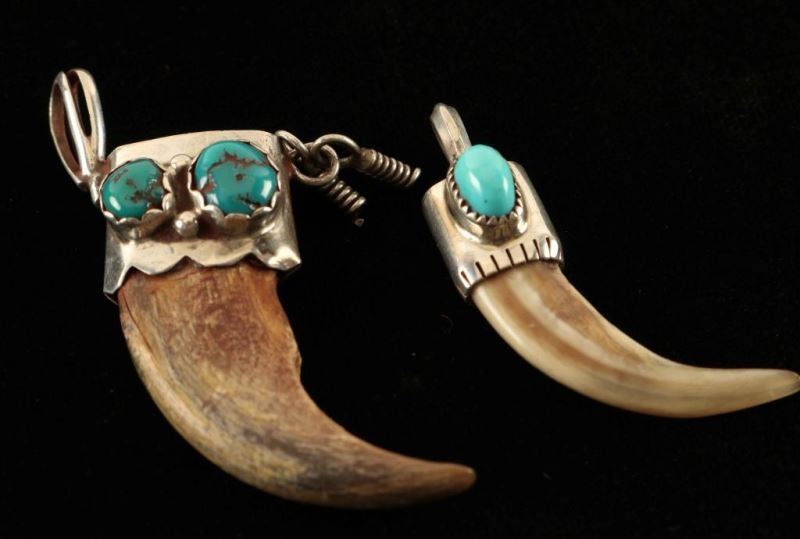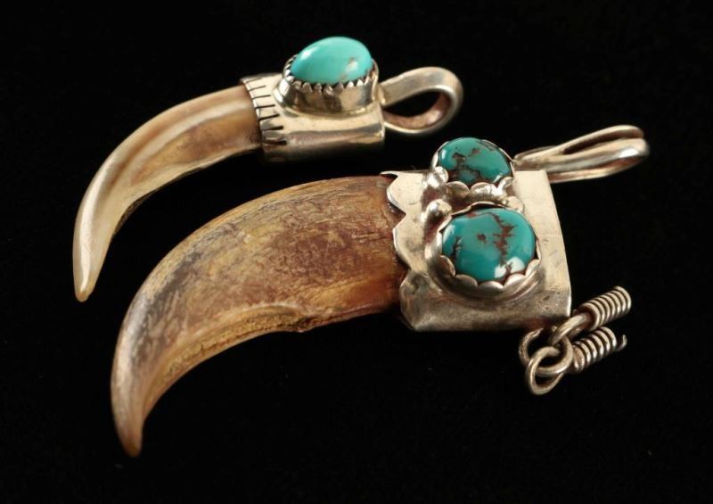One smaller claw pendant with a silver cap and small inset turquoise stone, and larger claw with silver cap that has two natural turquoise stones and silver dangles measures 1 3/4" long. Can not be sold in the state of California.