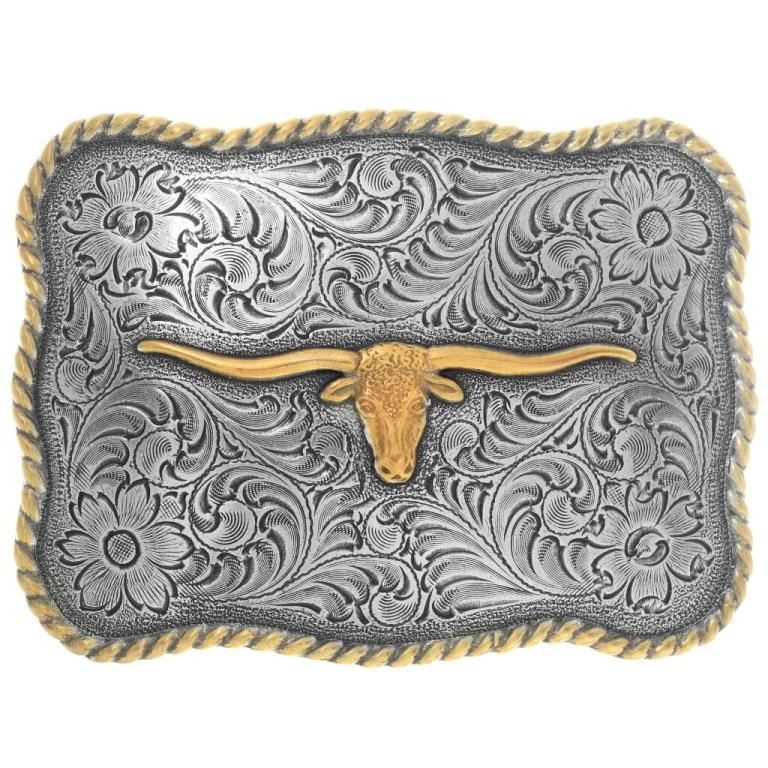 Includes (2) Buckles; This Gold Silver Longhorn Belt Buckle is a nice accessory, using a Texas steer and it's ideal for ridin' and ropin' cowpokes! A classic, western design, the background features a floral and scroll pattern and the edge is finished with a golden rope. It's 3-3/4" by 2-3/4" with a 1-1/2" keeper., and Western Silver Ranger Belt Buckle Set has traditional style that appeals to both men and women! A full size style, the buckle is 2-1/2" long by 2-3/8" at its widest for 7/8" wide leather. It comes with a matching keeper and a tip that tapers to a point. The high-quality, cast pieces are made from antiqued plate silver.