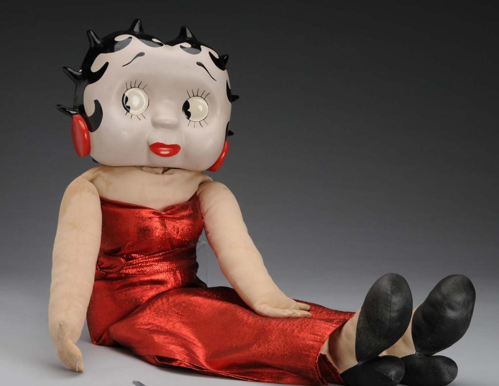 Both are unmarked. Betty Boop has composition head and cloth-covered body. Dutch girl has blonde wig, papier mache face, felt clothing and felt covered body. Moderate soiling to clothing on both dolls. Condition (Very Good). Size Largest: 36" T.