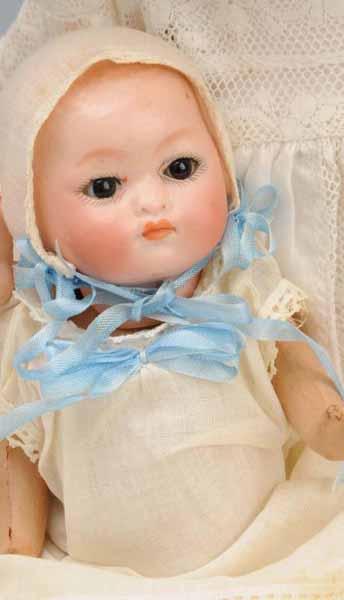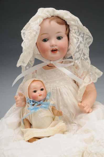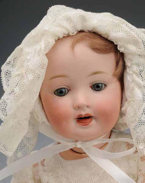 Description Germany, Ca. 1920. Bisque socket head incised "PM 914 Germany", made by Otto Reinecke, sleeping eyes, open mouth with teeth, composition baby body, lovely clothing. Bisque socket head incised "Germany", inset glass eyes, solid dome, closed pouty mouth, composition baby body (some wear and soil), dressed. Condition (Excellent). Size Largest: 15" T.