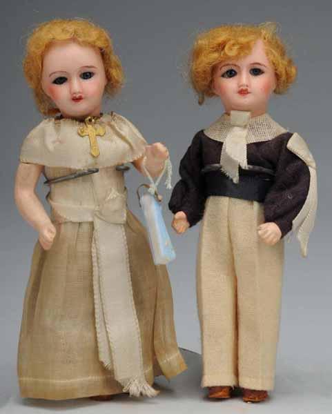Description France, Ca. 1910. Boy and girl incised "Unis France", glass eyes, open mouths, original mohair wigs, jointed five-piece composition body with molded shoes and socks. All original outfits. Condition (Excellent). Size Both: 6" T.