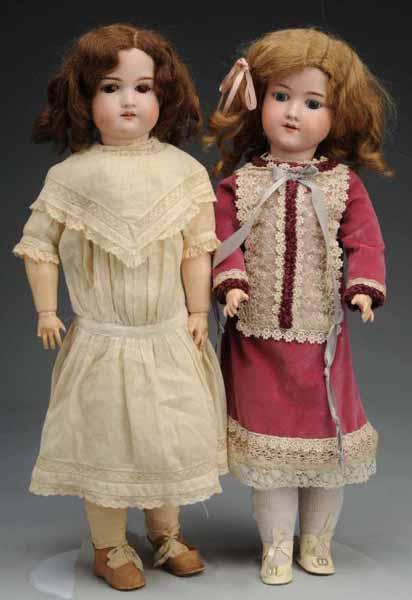 Description Germany, Ca. 1900. Bisque socket head incised "Armand Marseille 390n", set glass eyes, open mouth, vintage mohair wig, jointed composition body, redressed, vintage shoes. Bisque socket head incised Made in Germany, set glass eyes, open mouth, replaced wig, jointed composition body (1 finger broken), vintage white cotton dress, underwear, shoes and stockings. Condition (Very Good). Size Both: 23" T.
