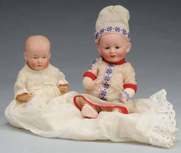 Description Germany, Ca.1910. Franz Schmidt & Co. 1271 with sleeping eyes, open closed mouth with molded teeth; Gebr. Heubach 7603 with intaglio eyes and pouty closed mouth. Both on composition baby bodies. Well Dressed. Condition (Excellent). Size Largest: 12" T.