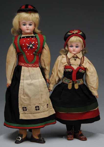 Description Germany, Ca. 1880s. Kling dolls with inset glass eyes, closed mouths, blonde mohair wig. Original cloth bodies with celluloid hands. Beautiful all original European regional costumes including shoes and socks. Condition (Excellent). Size Largest: 16" T.