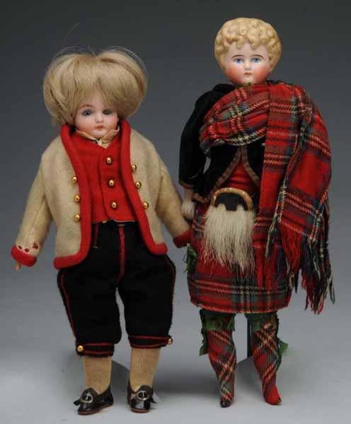 Description Germany, Ca. 1880s. Kling shoulder head with replaced wig, glass eyes, closed mouth, original cloth body with celluloid hands, original European regional costume. Kling shoulder head with molded hair and painted eyes, cloth body with bisque lower arms and legs, all original Scots outfit. Condition (Excellent). Size Largest: 12" T.