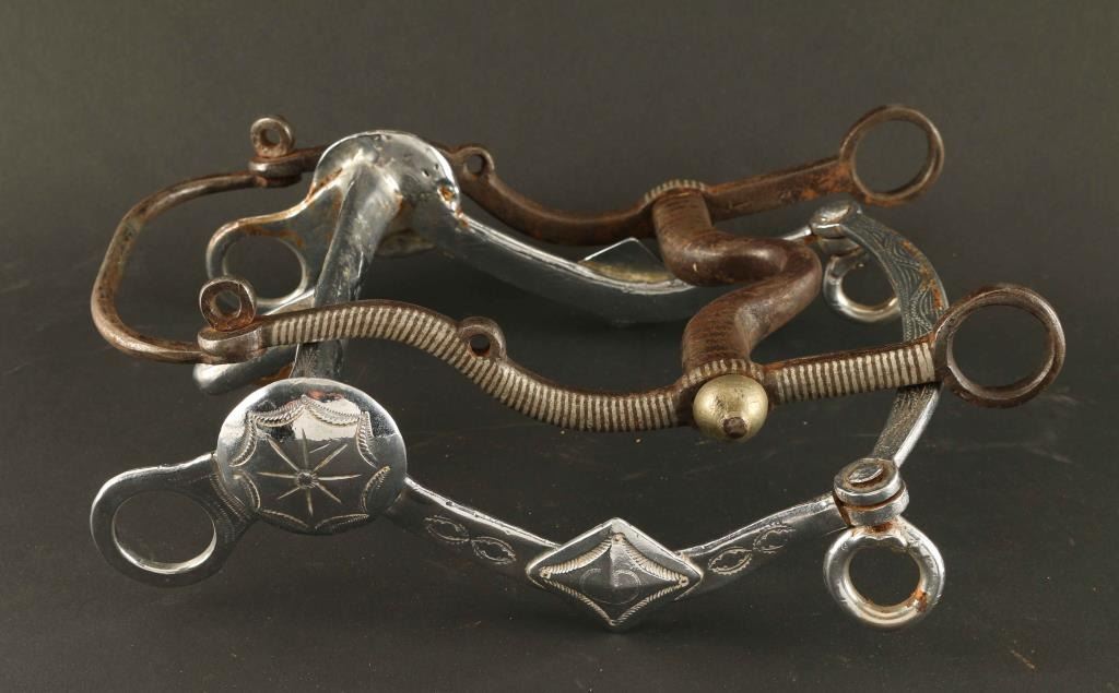 Silver parade bit with etched star, diamond and scallop patterns, shows some rust and a Mexican bit with silver lines which also shows rust.