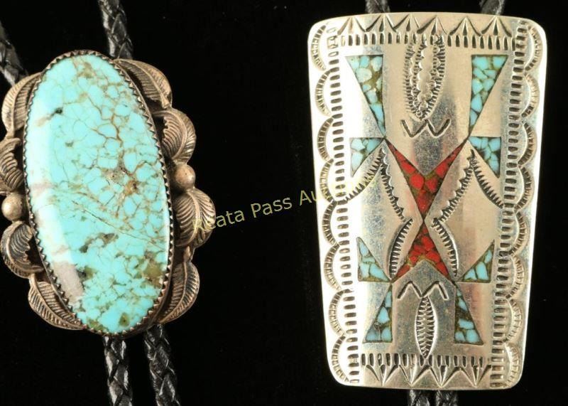1 Bolo with small sterling silver feather flourishes that surround a large center turquoise cab with black leather tie and silver ends. 1 Shield shape bolo with coral and turquoise inlay with maize pattern with black leather tie and silver ends.