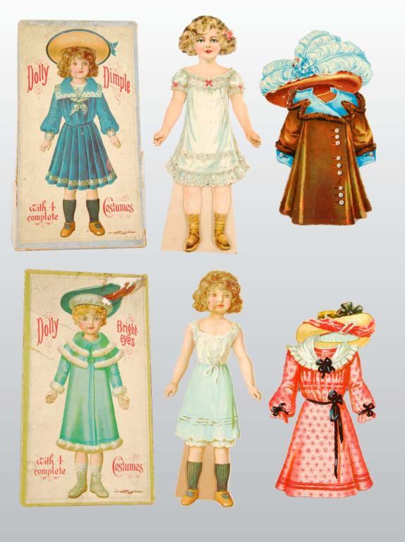 Description ND. "Dolly Bright Eyes", a 10-inch embossed Nister paper doll, has four outfits, two hats and an extra headless body. Attempts to repair the doll's broken neck failed. Her box is soiled and torn. This lot also includes a 10-inch Spear's "Daisy" in a damaged Nister "Dolly Dimple" box. The embossed doll has four outfits and three hats, all are damaged. The sets are in fair condition.