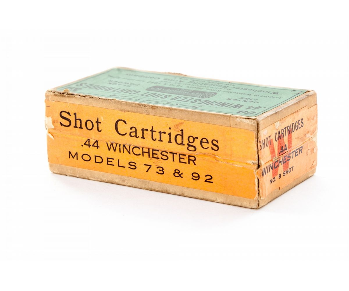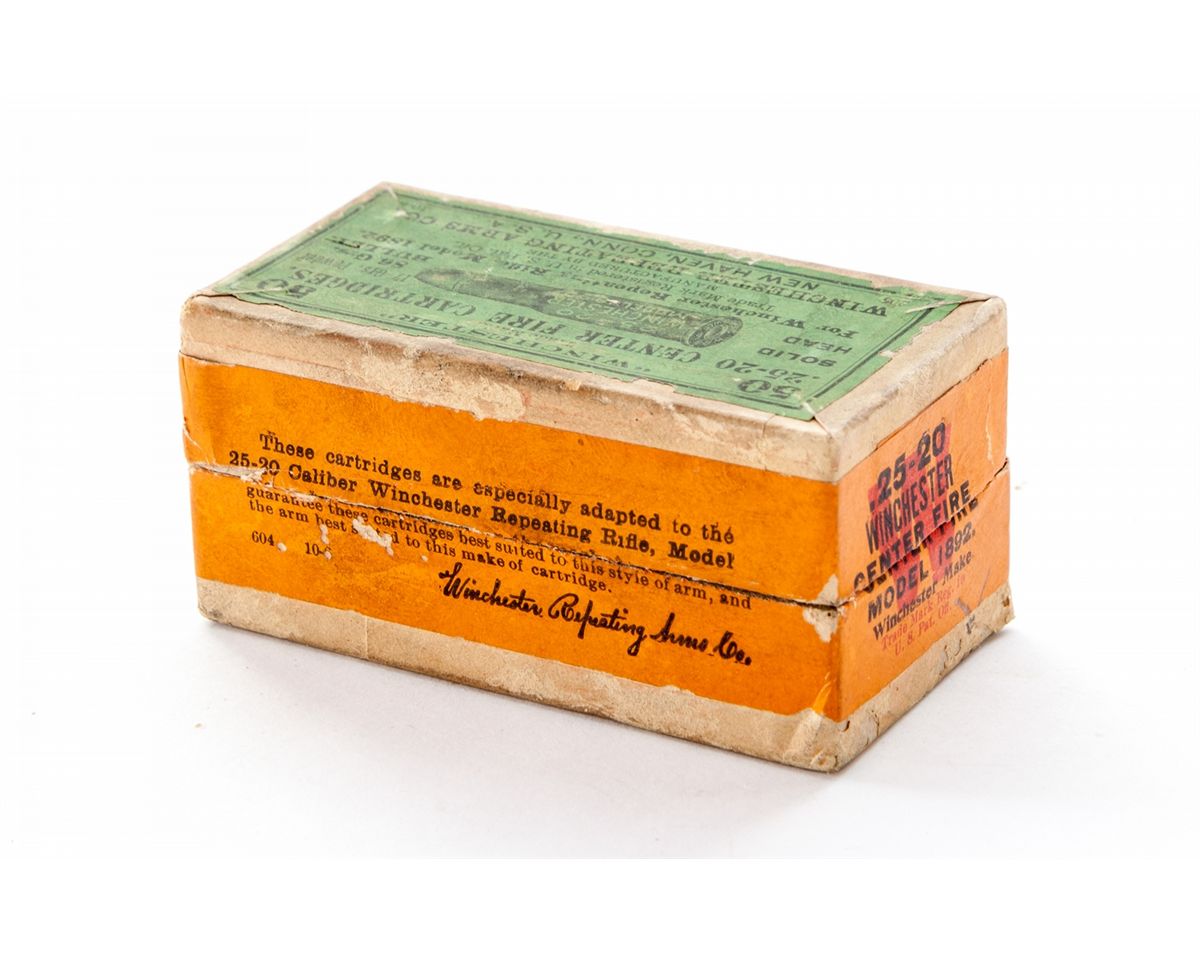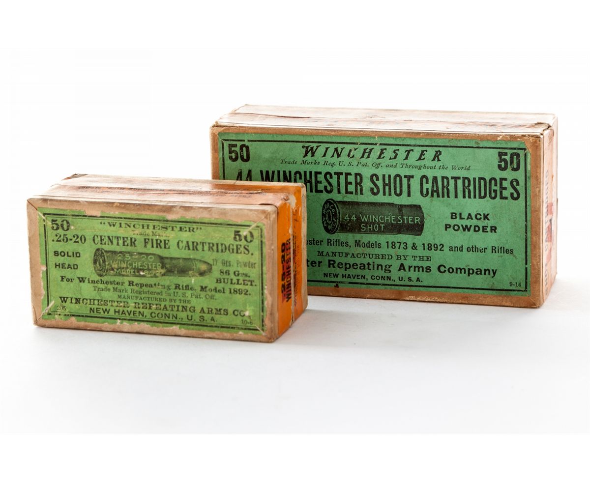 Two (2) Boxes of Green Labeled Winchester Ammunition, dating from the early part of the 20th Century. (1) Full box of .25-20 Centerfire cartridges, 50 rounds, 86-grain bullets, for Winchester Repeating Rifle, Model 1892. Label with 10-6 revision date. Condition is fine as full, but not sealed, with small losses to labels at perimeter. (2) Two-piece box of .44 Winchester shot cartridges, centerfire black powder, for 1873 and 1892 rifles. Top label with 9-14 revision date; orange side label with 3-19 revision date. All cartridges filled with No. 8 shot. Condition is excellent, as not sealed but full, with only the lightest wear to top label; orange side labels with small losses where the box halves come together. Est.: $400-$600/lot.
