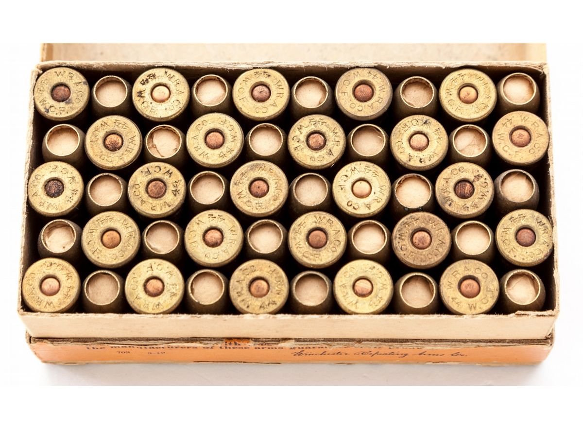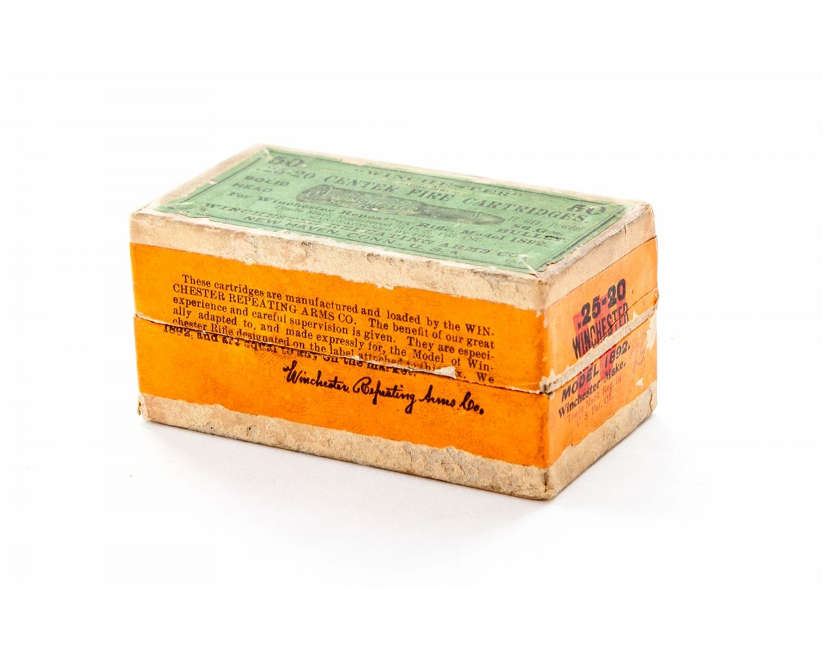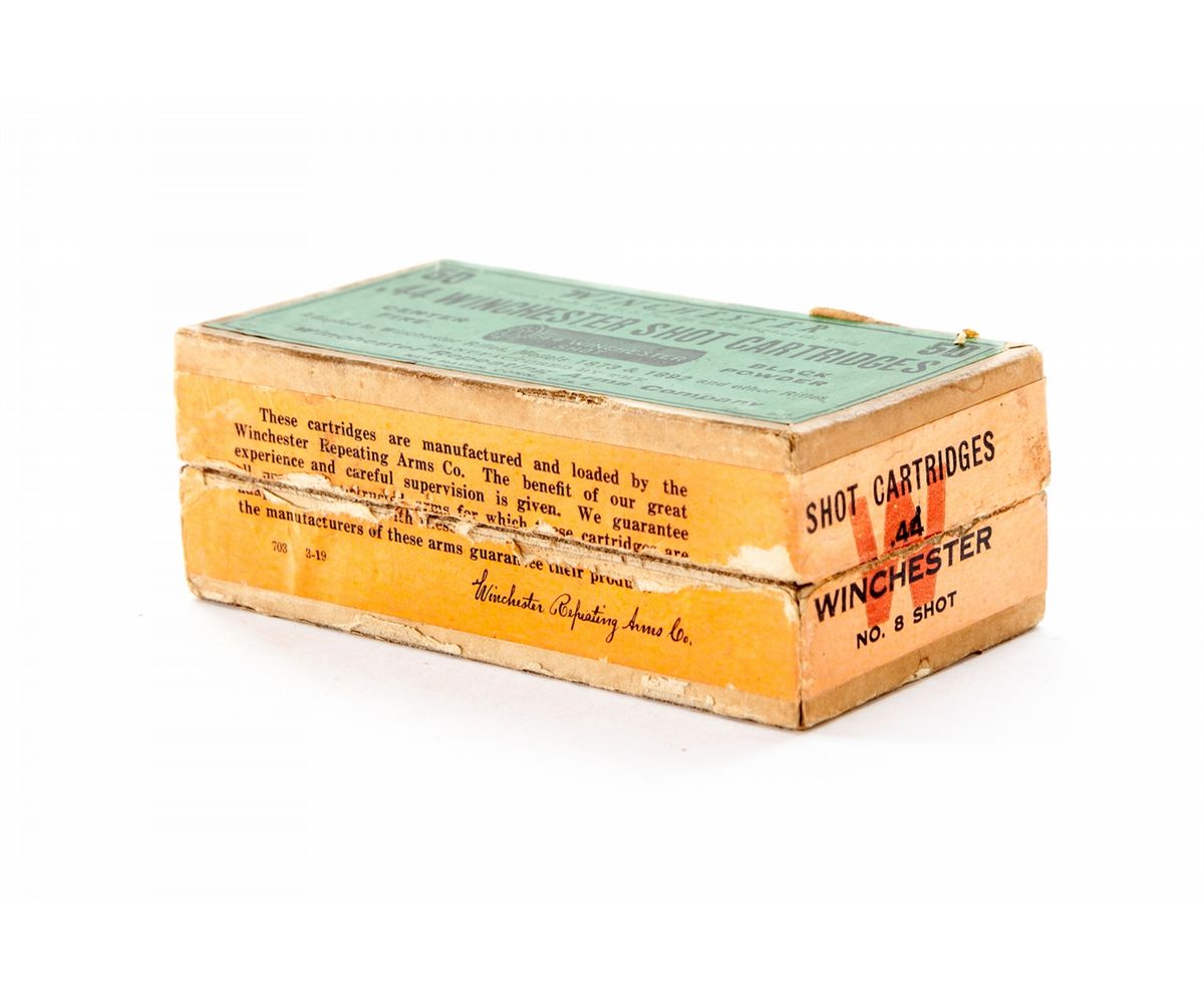 Two (2) Boxes of Green Labeled Winchester Ammunition, dating from the early part of the 20th Century. (1) Full box of .25-20 Centerfire cartridges, 50 rounds, 86-grain bullets, for Winchester Repeating Rifle, Model 1892. Label with 10-6 revision date. Condition is fine as full, but not sealed, with small losses to labels at perimeter. (2) Two-piece box of .44 Winchester shot cartridges, centerfire black powder, for 1873 and 1892 rifles. Top label with 9-14 revision date; orange side label with 3-19 revision date. All cartridges filled with No. 8 shot. Condition is excellent, as not sealed but full, with only the lightest wear to top label; orange side labels with small losses where the box halves come together. Est.: $400-$600/lot.