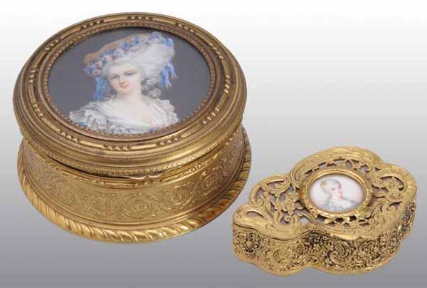 Description Includes one box with ivory portrait of lady and signed "Aubry". Also includes another box with ivory portrait of lady but the second is unsigned. Both boxes have strong hinges. Condition (Excellent). Size Largest: 4" Dia.