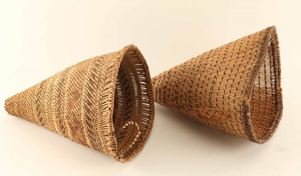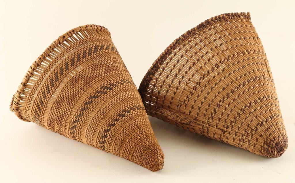 Washoe small burden basket, handle wrapping is loose circa 1940 measures 10"x8" and a Maidu miniature burden basket, broken rim and hole in side circa 1920 measures 10"x8".