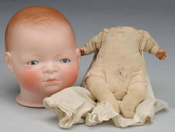 Description Ca. 1923. Large bisque head signed Copr by Grace S. Putnam, 15 ½” head circumference. 6” long signed Bye-Lo body with perfect celluloid hands, with vintage dress, slip, and diaper. Condition (Very Good).
