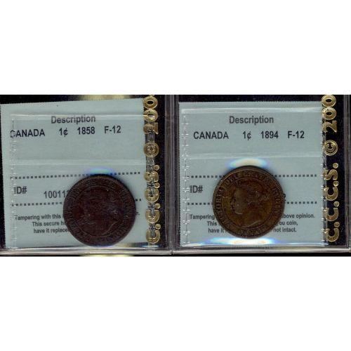 Lot of 2 CCCS F-12 graded Large cents; 1858 and 1894
