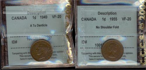 Lot of 2 CCCS graded Small cents; 1949 "A" to dent., 1955 NSF. Both VF20