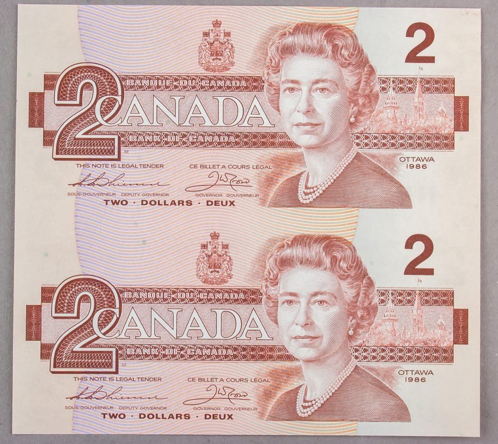 Lot of 2 Canadian bills. Of denomination $2. Issued 1986. Uncut. 14 x 15.5 cm.