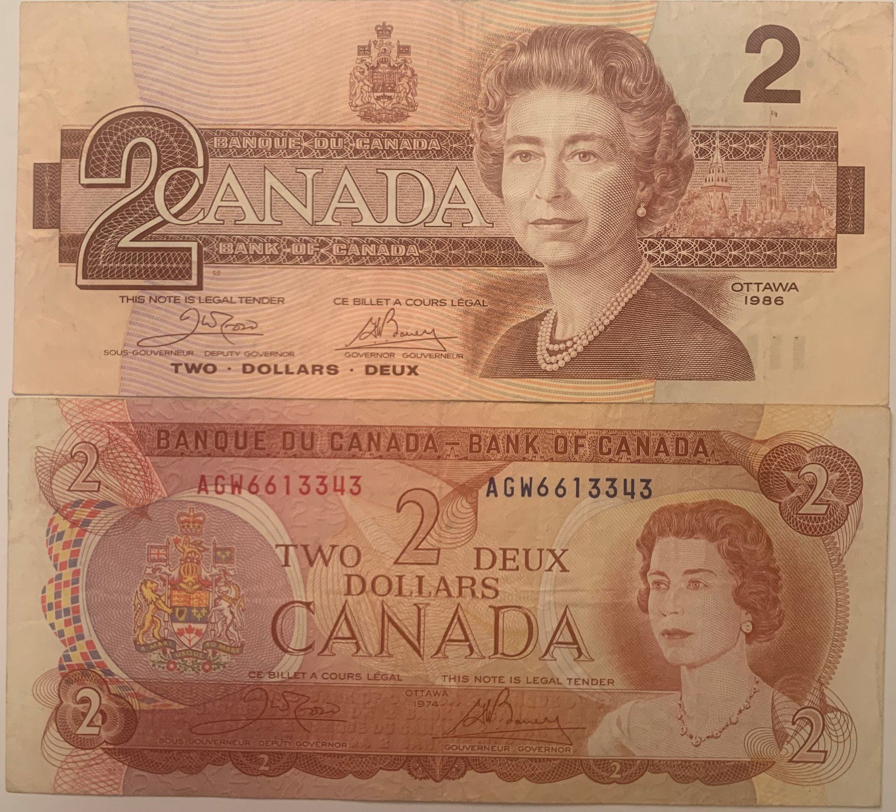 Lot of 2 Canada 2 Dollar 1986 and 1974 Bank of Canada