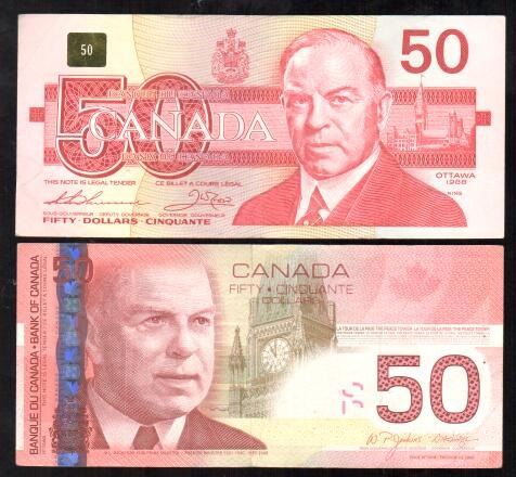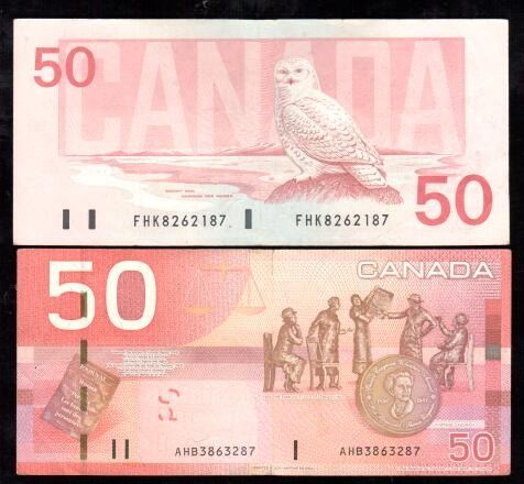 Lot 332; Lot of 2-Canada $50 Bank of Canada, 1988 Bank of Canada #FHK8262187 Thiessen-Crow, 2004 $50 Bank of Canada #AHB3863287 Jenkins-
