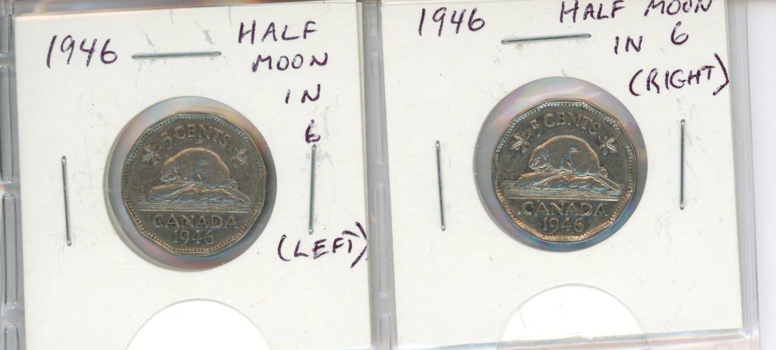 Lot of 2 Canadian 1946 Nickel Varieties. Includes Half Moon on left side of 6 and Half Moon on right side of 6. Both coins grade Fine or better.