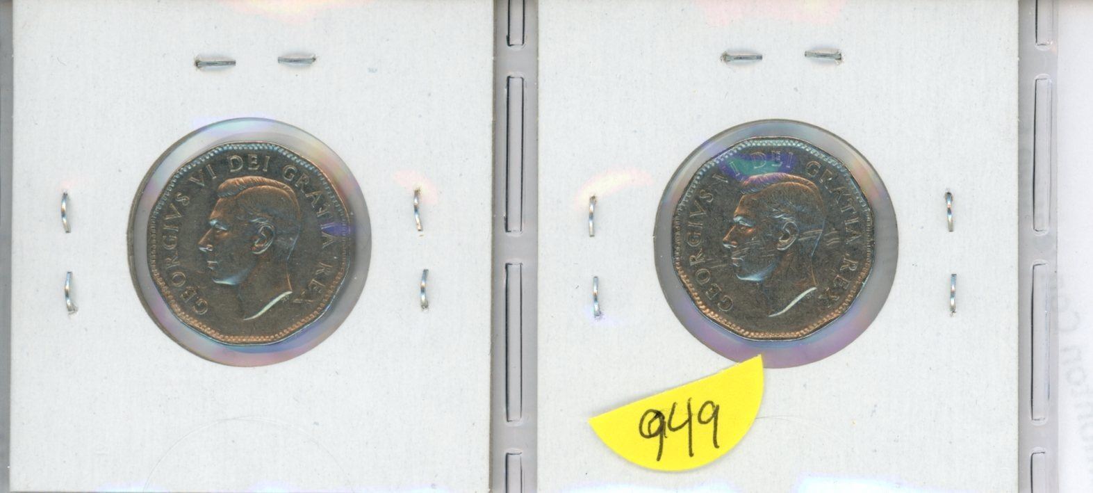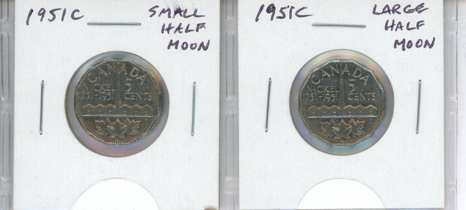 Lot of 2 Canadian 1951 Commemorative Nickel Varieties. Includes Small Half Moon and Large Half Moon varieties. Both are the result of different Die Clashes. Coins grade VF to EF.