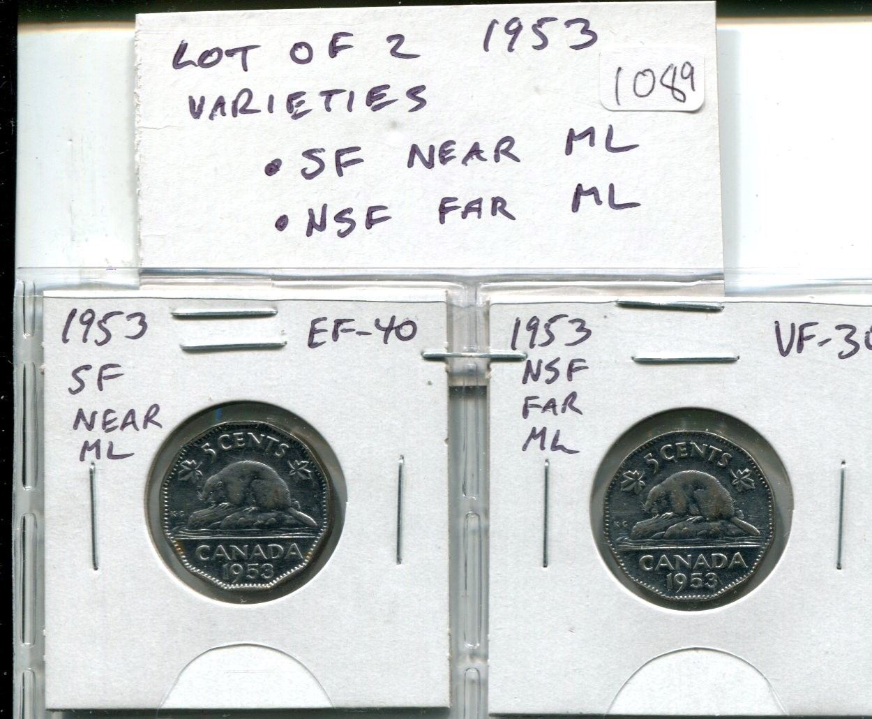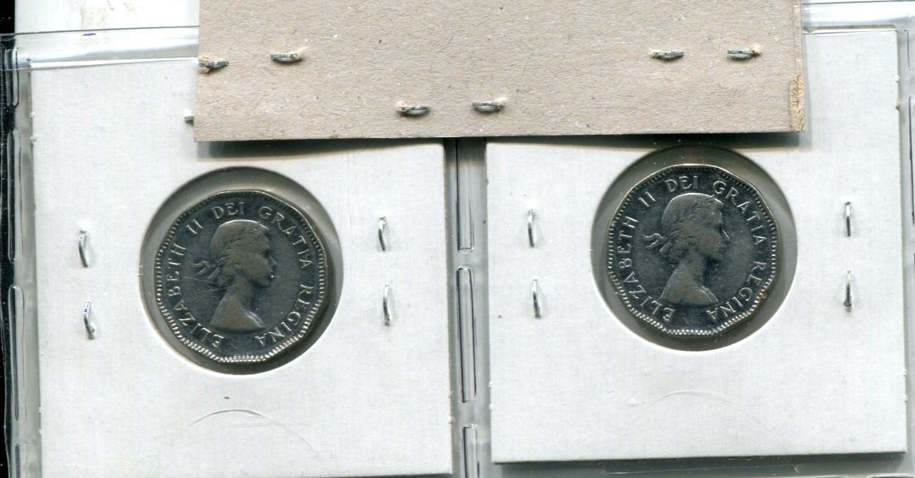 Lot of 2 Canadian 1953 Nickel Varieties. First year of issue for Queen Elizabeth. Includes Shoulder Fold with Near Maple Leaf and No Shoulder Fold with Far Maple Leaf. Coins grade VF-30 to EF-40. Nice.