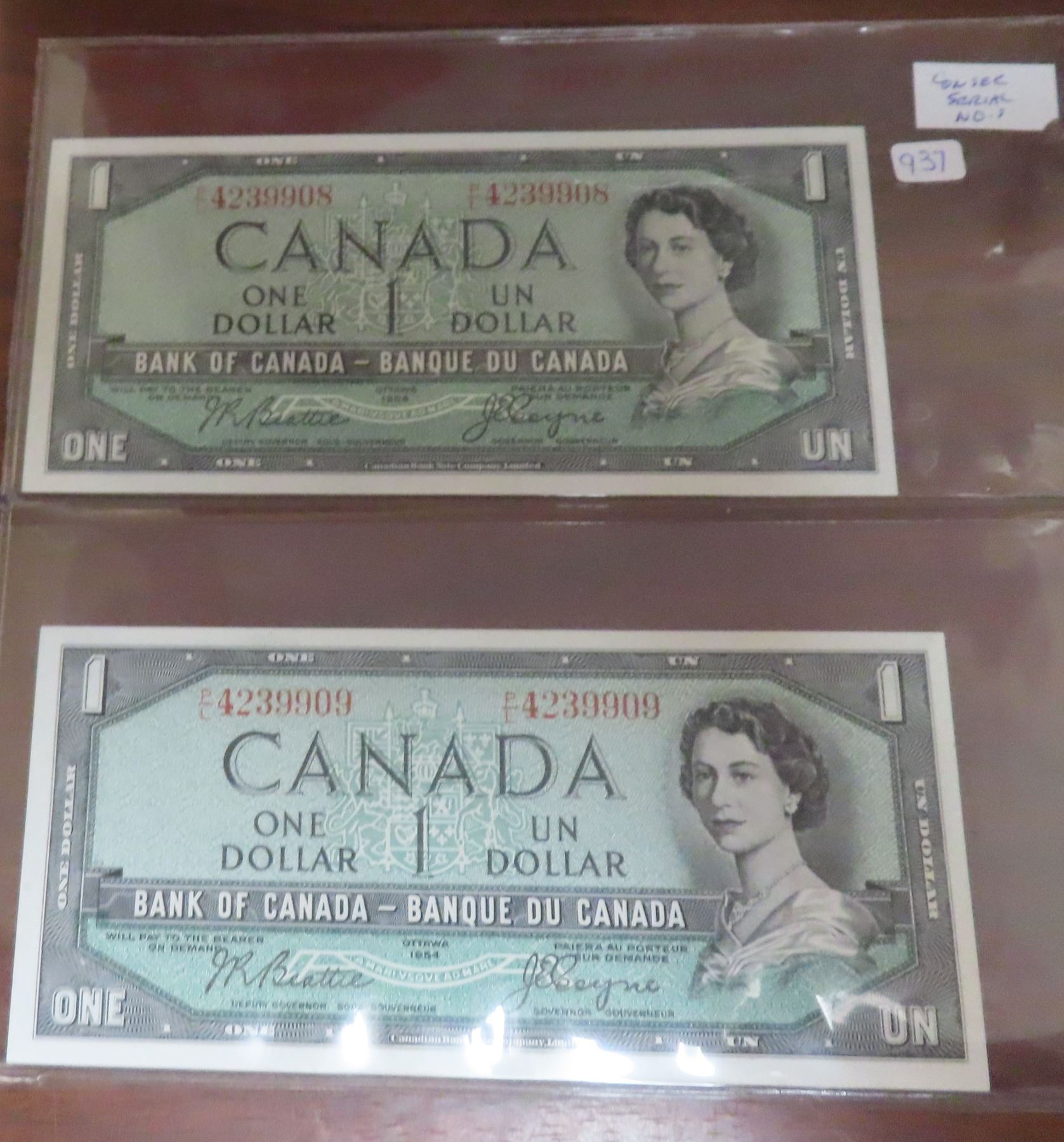 Lot of 2 Canadian 1954 Modified Portrait $1 notes with Consecutive Serial Numbers. Beattie-Coyne signatures. P/L Prefix. SN 4239908 & 4239909. BC-37a. Gem Uncirculated.