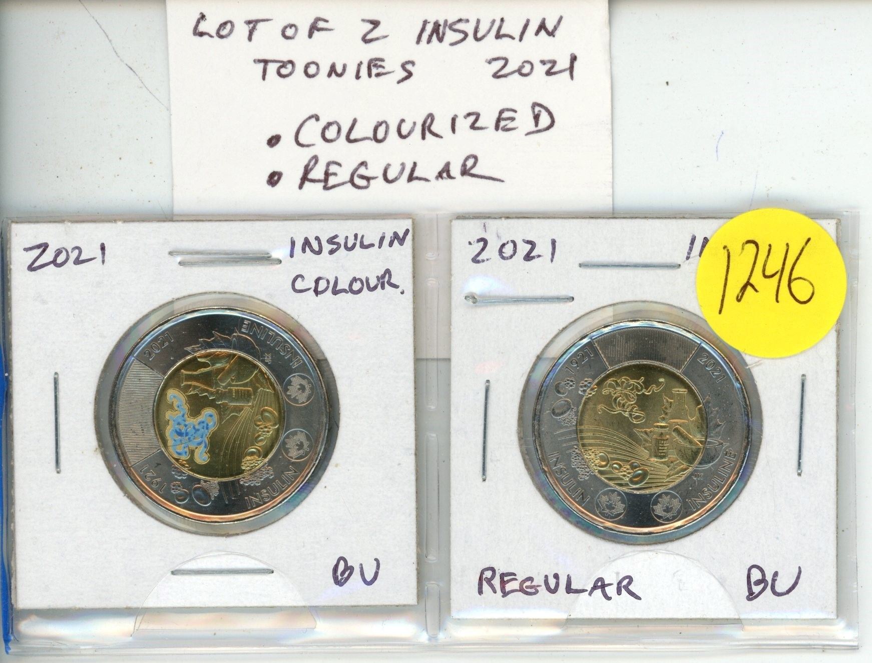 Lot of 2 Canadian 2021 Insulin Toonies. Commemorates the discovery of Insulin by Doctors Banting & Best. Includes Colourized and Regular. BU from original rolls.