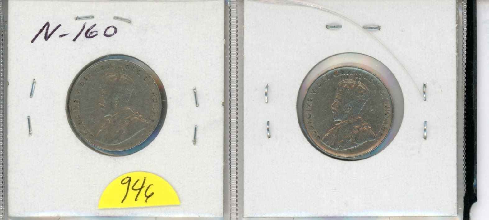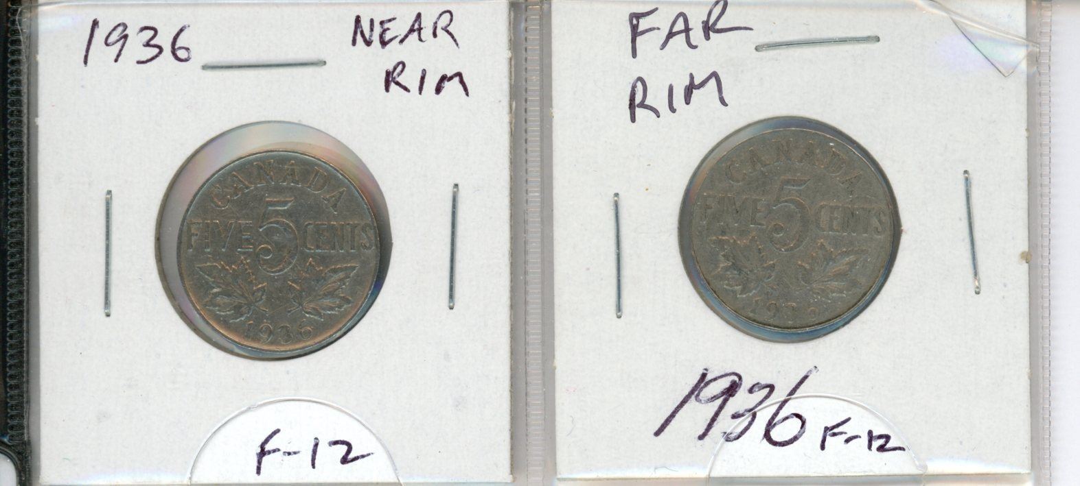 Lot of 2 Canadian George VI Nickel Varieties. Includes Near Rim and Far Rim varieties. Both coins grade Fine.
