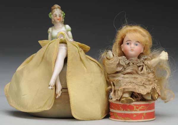 Description Germany, Ca. 1920. One bisque head girl with painted features, replaced wig, composition arms and legs sits on a small red cardboard candy box. Another is a China half doll with legs, sits on a satin egg with overskirt. Condition (Very Good). Size Both: 4" T.