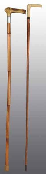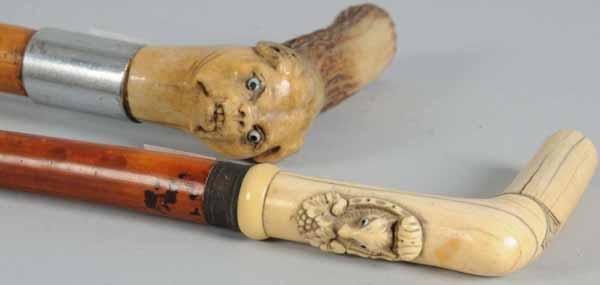 Description One cane is made of bone with a dogs head and the other has an animal head carved into bone or ivory. Condition (Excellent) Size Both: 35" L.