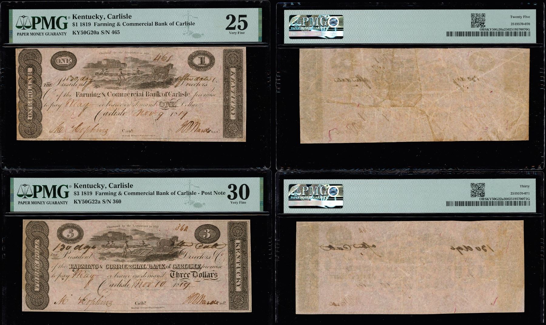 Lot of (2) Carlisle, Kentucky Farming & Commercial Bank Obsoletes: $1 Nov. 9, 1819 G20a PMG Very Fin