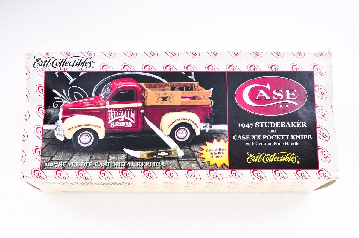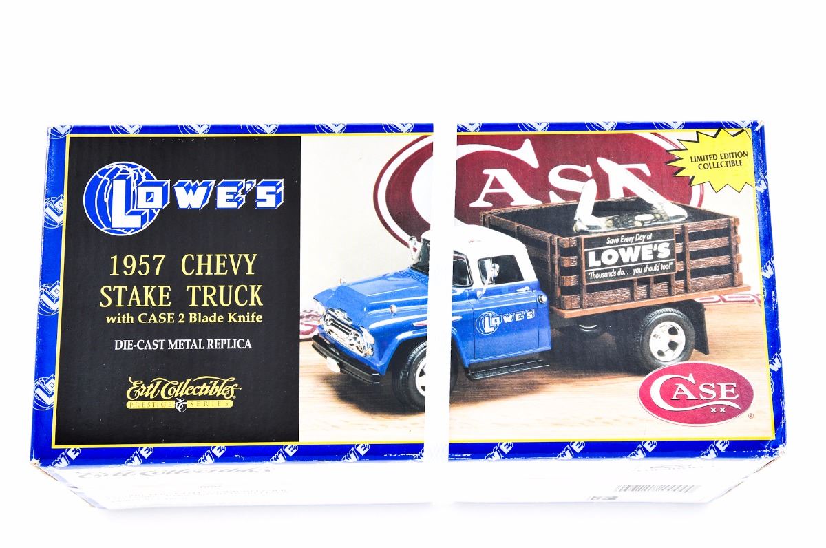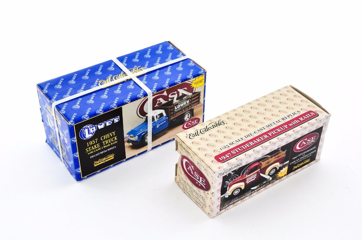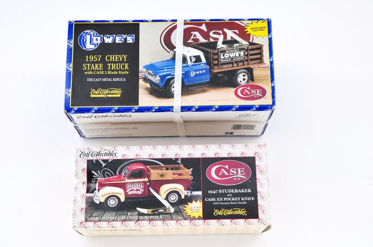 Lot of Two (2) Case Collectible Sets, by Ertl Collectibe series, each including one Case knife and vintage diecast truck model: (1) 1957 Chevy Stakebed Truck with Lowe's logo, and includes a Case two-blade knife. (2) 1947 Studebaker Pickup Truck decorated with High Quality Hardware & Supplies logo, and includes a Case XX pocket knife with genuine bone handle. Both are as new, in their original boxes. The 1957 Chevy truck has never been opened. The 1947 Studebaker box shows some damage to one end. Est.: $100-$200/lot.