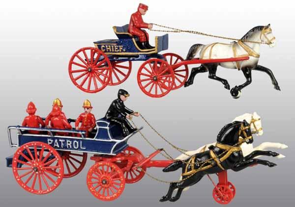 Description Includes one fire patrol wagon with five removable figures and one fire chief wagon with one removable figure. Both toys are reproductions. Condition (Mint). Size Largest: 22" L.