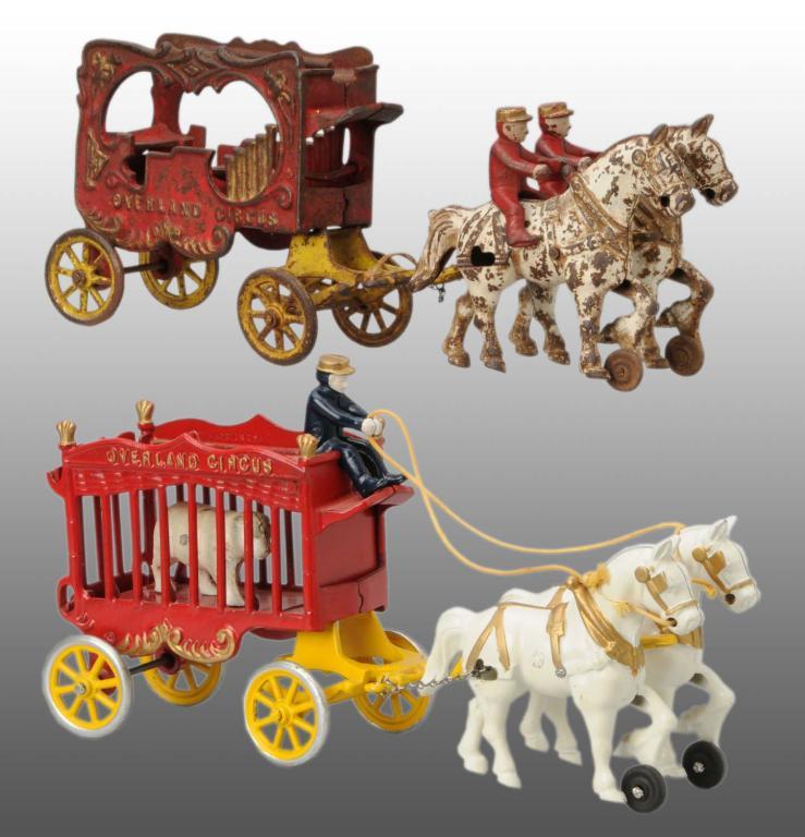 Description Both are two-horse-drawn, one with driver and two other riders, the second with no figures. The circus cage includes a polar bear inside. One is restored and the other has 60% of its original paint. Condition (Good - Very Good). Size Both: 16" L.
